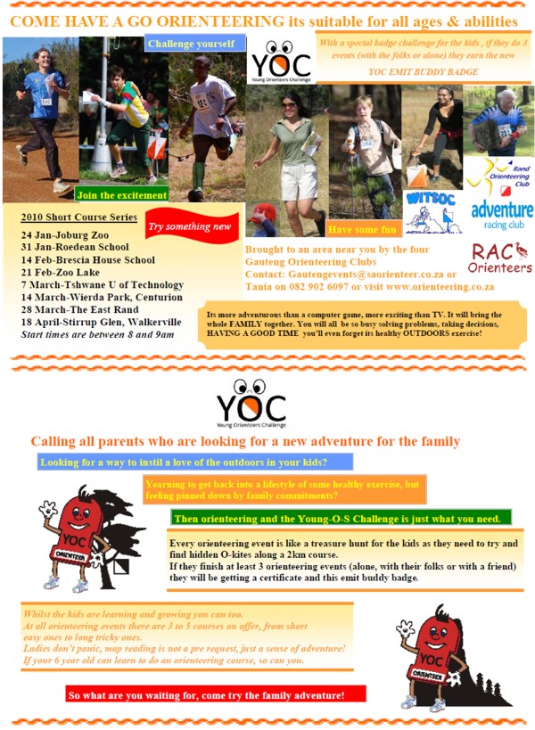 The Gauteng orienteering season begins on Sunday, 24 January 2010, with a much-loved short-course event at the Jo’burg Zoo. As the first of the eight-event series, this Zoo event – held at a location that is familiar to many – is the perfect place for beginners (adults and children) to try this fun map-and-compass navigation sport.