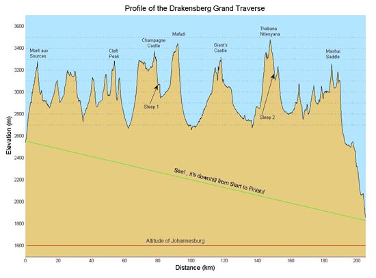 Before we started the DGT I did a couple of calcs in order to get a gut feel of how long this would take. I based my calcs on my Wartrail and Skyrun (100km Southern part of the Drakensberg) times and felt that if all goes well I should be able to do this under 50 hours. However the first thing I realised upon starting the DGT was the difference in altitude. During Skyrun, the average altitude is most likely below 2500m with the highest peak at Tiffendell – a cool 3001m high. The DGT on the other hand, started at 2550m, immediately climbed to 3000m at the chain ladders, and from there on it basically stayed in a band of 2800m to 3400m with the highest point, Thaba Ntlenyana, at around 3460m. Around Mont aux Sources I realised that my sub-50 hours might have been optimistic.