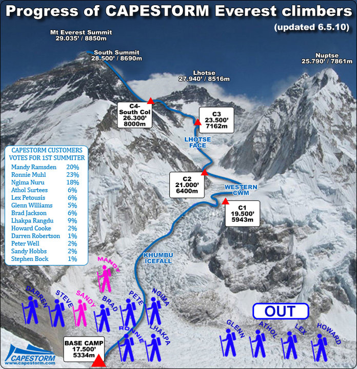 Mandy, climbing with the Kiwi outfit Adventure Consultants (they’re posting daily dispatches on their site – nice reading), is most notable as a successful Everest summit will make her the first South African woman to tick off all Seven Summits. Mandy is sending updates through to CapeStorm’s Facebook page. Ronnie’s team is Adventures Global and he has four South Africans with him (the rest seem to be Aussies)