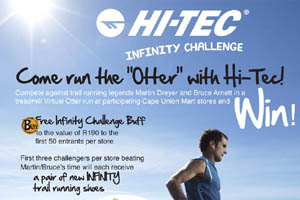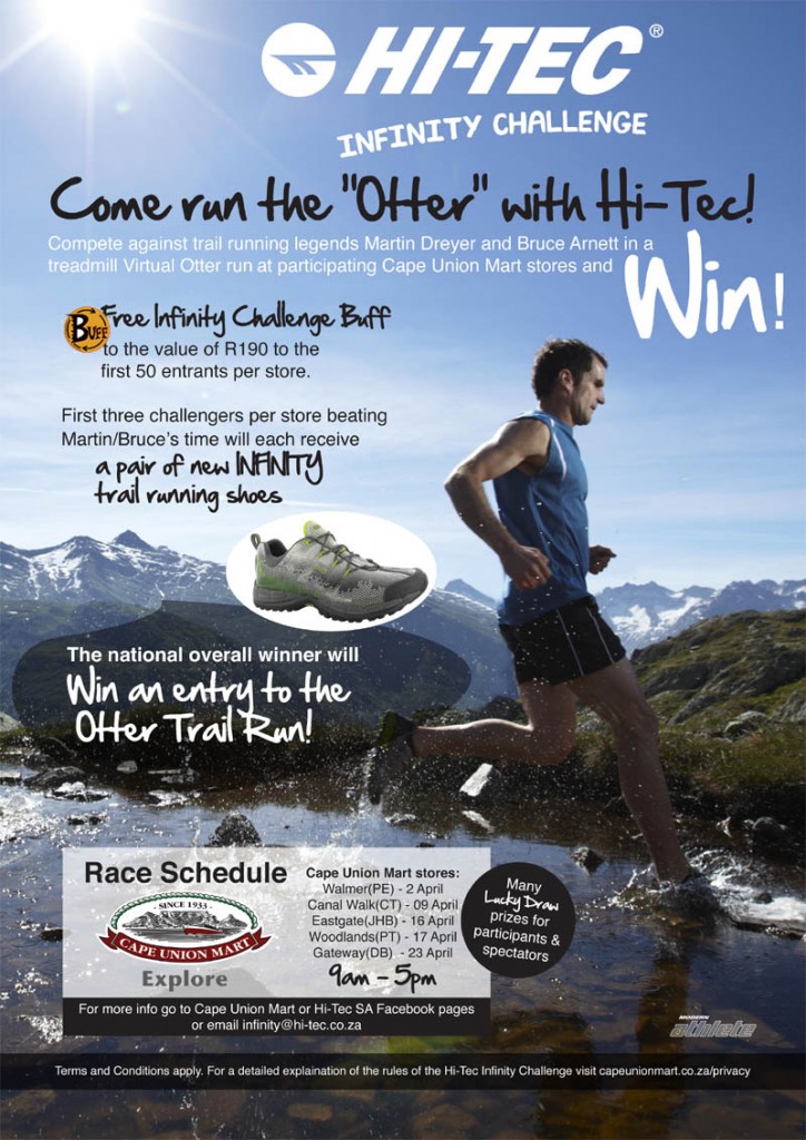 Hi-Tec’s new trail running shoe, V-Lite Infinity has just hit Cape Union Mart stores. During April, five Cape Union Mart store will participate in the Infinity Challenge, an activation that encourages runners to race against Hi-Tec brand ambassadors, Martin Dreyer and Bruce Arnett, over an undulating two kilometre treadmill course that mimics a section of the Otter Trail Run.