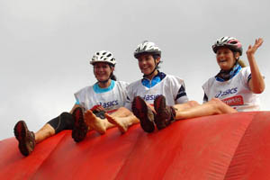 | Taking the slide down easy – these obstacles look like harmless jumping castles but they’re not. If you slide too fast and land hard you could be in for a broken ankle – Jackie knows first-hand. |