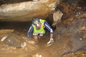 We set our bikes down at the transition and ran up a short path, to find a 50m abseil waiting for us. Luckily we got there first, as this saved us some waiting when the other teams arrived. Wayne and I got our harnesses on before Alec and were allowed to descend, while Amy and Alec had to run down into the cave.