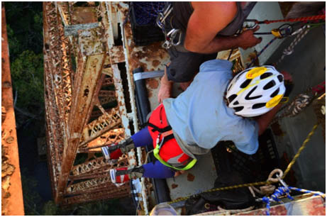 This was a world-class setup with bridge crossing that got the adrenaline engines going again! Brian broke the fear with crossing first, but falling twice off the line! Giving the rest of us the jitters, and no hope of a safe crossing… Luckily we learned from his mistakes and balanced ourselves safely across and zipped down the 50m abseil. Thankfully not making history on a famous bridge; that already claimed 34 lives before.