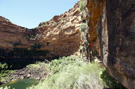 Red arrow indicates a person hanging on a rope - that's certainly where you're goin' too.