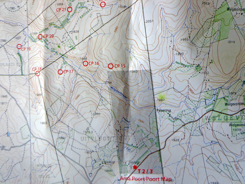 William did provide control descriptions – I didn’t see them directly; I picked them up second hand from Mark’s map. We kept each other company out hiking and looking for teams. Most control descriptions were perfectly adequate; a few needed a dash more of specificity. “Waterfall” would have better been described as “Bottom of waterfall in kloof” and “Tree in kloof” would have been better described as “Tree in kloof, river right”. We actually went river left, as indicated by the hiking trail on the map. You can’t get to the tree from river left.