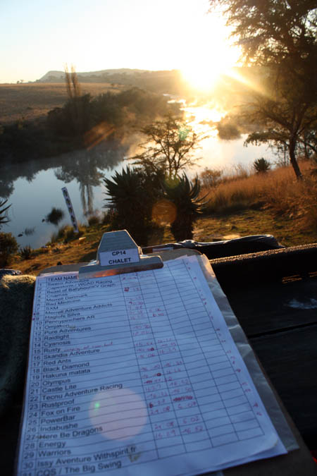 With the water level in the Tugela dropping as fast as I type, there has been a change to this long paddle leg for all teams behind Merrell Denmark. Teams are being halted at CP14 (Tugela Rapids) and moved ahead to the transition at Spionkop Dam so that they can continue with the cycle leg.