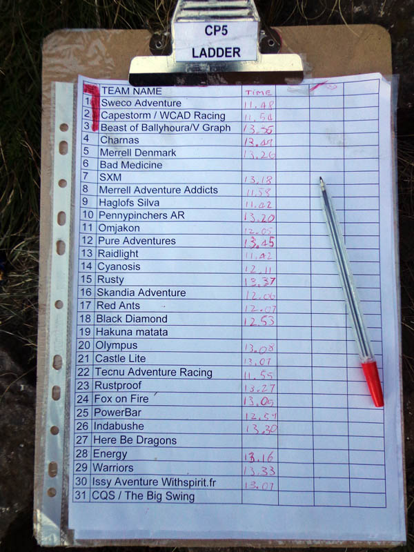 Teams at the back are moving very slowly. Descending late this afternoon I saw CQS / Big Swing, Bad Medicine and Hakuna Matata will edging towards the Chain Ladder. According to the marshals it seems they were clear of the waterfall (CP6) only at 17h15. Sunset is around 17h30… They’d do well to walk a bit, set up camp, have a good sleep and to move at first light. They would benefit more from a good rest than from progressing even slower in the dark.
