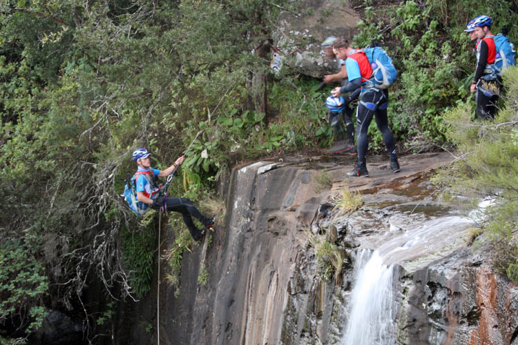 Then we headed up the road to the base of the abseil point, which is a beautiful waterfall cascade of four or five drops. The climb up is pretty steep, on typical grassy tussocks with a dash of rock scrambling. At the base of the first waterfall we spotted Capestorm WCAD. I didn’t get to speak to them then as they were across the other side of the stream from me but they looked A-ok. I did see them later as they came into T5 looking really, really good. My gut feel (not from number crunching) is that they have probably been one of the most steady and consistent teams in this race – together with Olympus and Castle Lite – both of whom where not far behind.