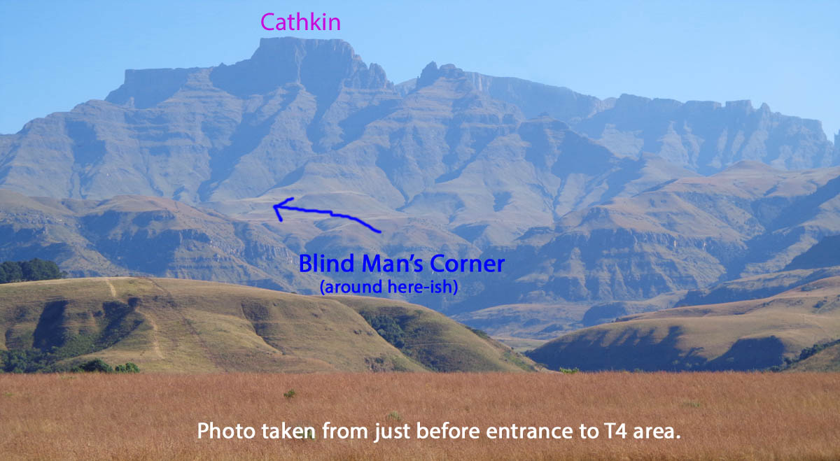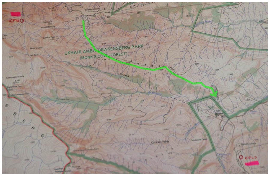 • Yellow line: This is the more direct route. The same friend who dropped the marshals was out here hiking in the past two weeks. He says that although you have to slog uphill on no real track – following drainage re-entrants, once you’re over the Sterkhorn-Cathkin saddle there’s a clear trail leading down to the Contour Path. Not easy in th day; harder – for sure – at night.