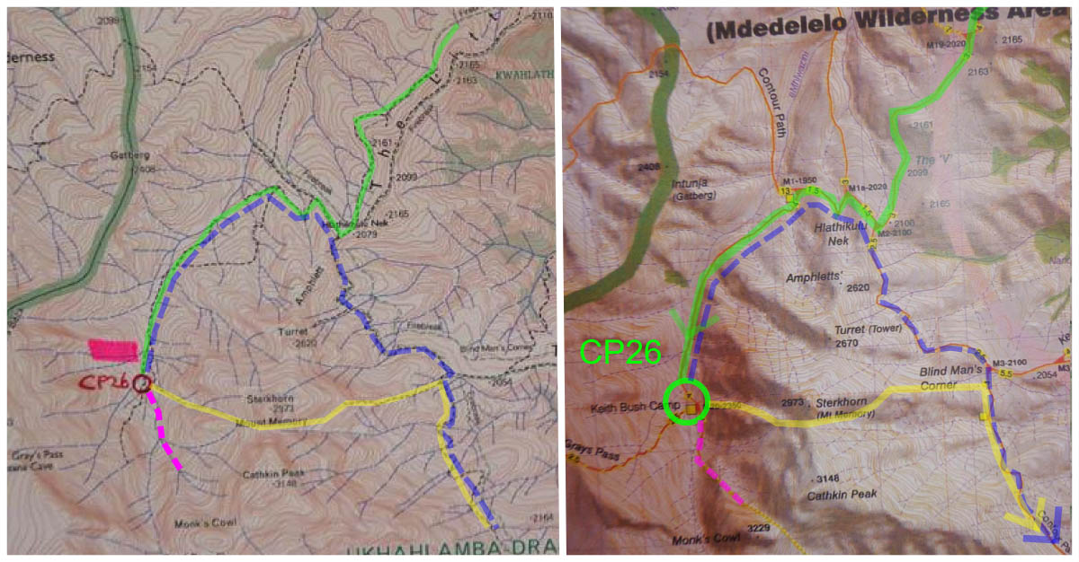 Let’s zoom in on what is happening in the CP26 (Keith’s Bush Camp) area. I’ve put the same section of topographic map (left) next to the hiking map (right) part of this same area.