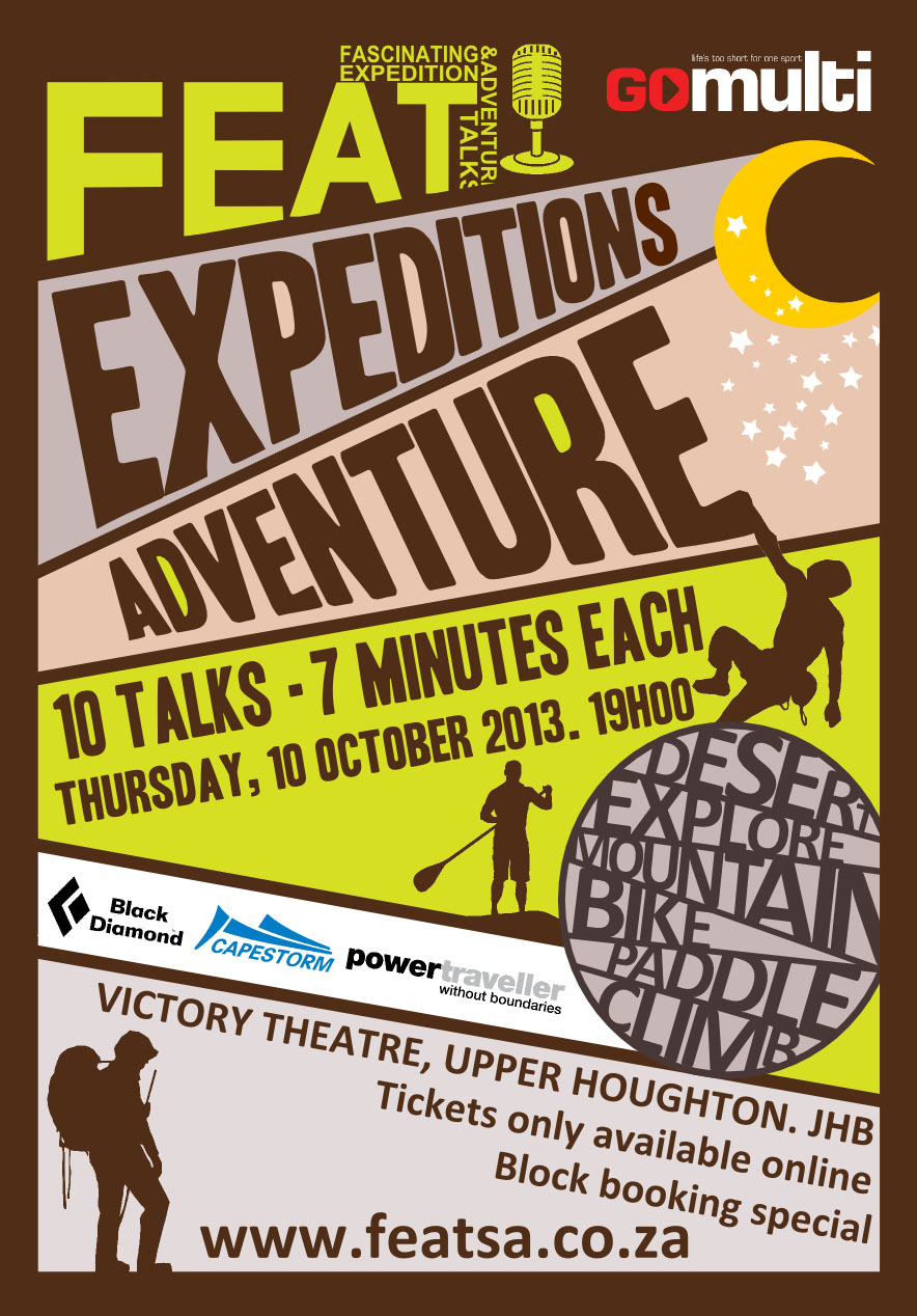 Just when Cape Town has been feeling totally left out, FEAT is delighted to announce the first mini-FEAT events, in partnership with Mountain Club of South Africa (MCSA), which take place in Cape Town on the evening of Thursday, 14 November and in Jo’burg on Monday, 18 November 2013. Details for these events will be announced after FEAT in October.