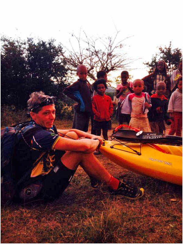 As we approached the next TA for the kayak, despite my dirty water fill up, I was feeling very dehydrated so scooted off in front of the team with my only vision that of the fresh water at the TA. Here in a large tent we found our bike boxes and a re-supply crate, and our kayak wet bag with our kayak stuff in it. Our transition was not particularly fast, but some time out to drink, and eat and get bikes stowed away and sort out the kayak gear etc took a while. Unfortunately we lost most of the daylight by the time we started to try and lug these heavy boats the 1km down to the river. Ignoring the attention of several small village children attempting to help us in some way – maybe we should have paid them 100 Rand to carry our boats as they were very awkward – we eventually got to the river launch exhausted and pretty much in the dark.