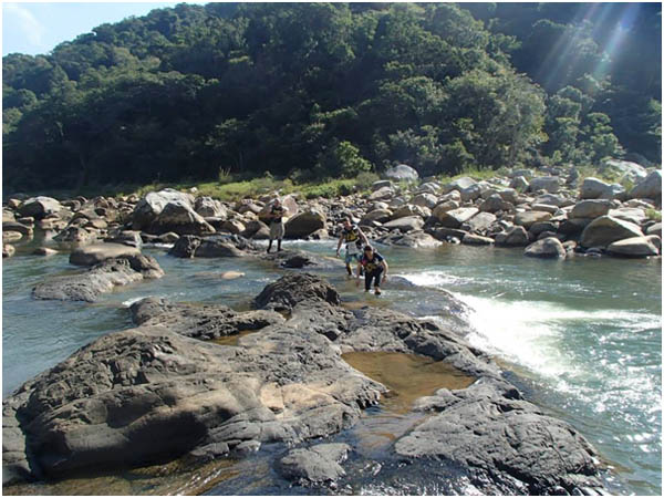 Going ashore in a land of long reeds – note that at various points in the race we were walking through long grass or reeds with full knowledge that according to the locals there were frequent sightings of “Black Mamba” snakes! We were moving at what I thought was a good pace until 3 x teams came up behind us and wanted to get past. As we let them through, we then spent the rest of the upward climb behind them as they ended up not being any faster than us, and this did contribute to our first nav error. As we crested the climb following the butts of other racers, and with our caps on we managed the unthinkable and walked straight past the obvious checkpoint painted on the big rock right in front of us. This had a knock on effect later in the race, as we walked on for a further 15mins before conceding we had missed the CP, so another 15mins back to get it, and passed by about 5 teams in the process (when we got to the abseil long wait, we had about 6 teams in front of us). Despite that early hiccup, we went along quite well, and once descending again to the valley floor, we did some fancy footwork to cross over the river and make a speedy route along the side. Eventually we had to cross back over and saw way up ahead a team walking across the river. We however missed the “magic” walkway, which was hidden by waist deep brown water, and instead chose to hug a muddy bank like desperate monkeys until we eventually fell into the deep water and had to swim across to the other side.