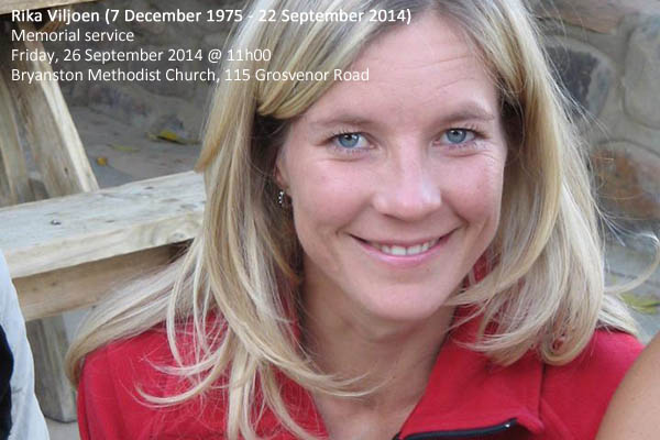 This is just a brief note to let you know that Rika Viljoen is in hospital with bacterial meningitis. (Updated Fri, 19 Sept 2014)