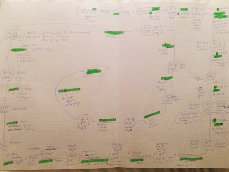 In a post on Saturday on FB, James wrote that there are 20 legs in the race and “Gear and food admin nightmare!”. This is his chart planning transitions and gear boxes and legs.