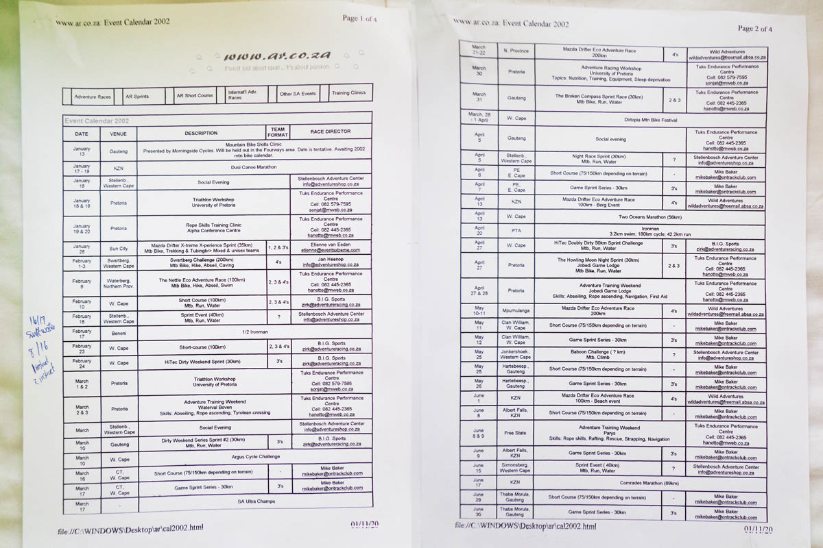 Blast from the past! Lookie what I found! A printed 2002 www.AR.co.za event calendar as it stood on 19 November 2001.