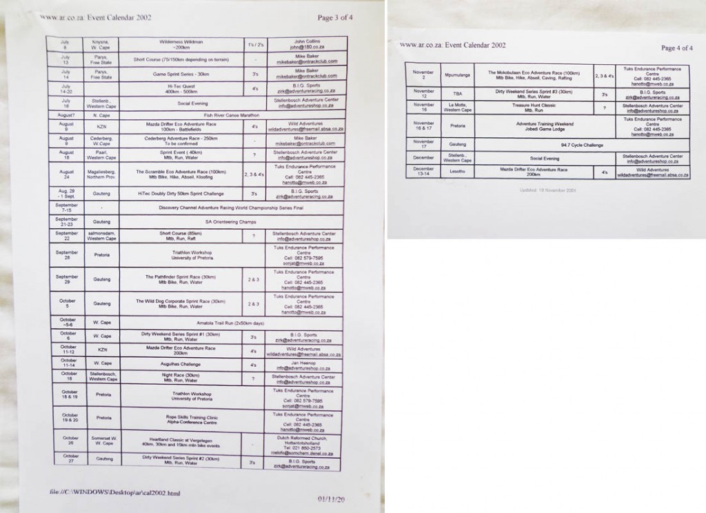 Blast from the past! Lookie what I found! A printed 2002 www.AR.co.za event calendar as it stood on 19 November 2001.