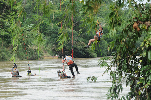 Entertainment is provided by athletes dressed up in comical outfits – clowns, jail breakers and pirates to name a few – all attempting to win the spirit award. Our rental kayak has a squeaky rudder and strange seating position but an hour and eight minutes late, with cramping bum muscles, and all arrive at T1 in 8th position. Swapping lifejackets for running shoes and hydration packs, we set off on the first trekking leg.